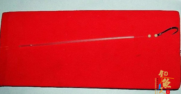 从渔具店买来绑好的串钩,把钩子和连接线剪掉,换上丸世12-16号钩,钓组上的挡珠和皮管继续留用(不够时可以利用挂吊针的小皮管),用2-3号的透明尼龙线重新捆绑。铅坠和太空豆的位置,上下太空豆之间20-60厘米,供铅坠活动。这样鱼拉到水面时一般不太会跑掉。潮水小的时候,可以把最下面的铅坠拿掉,加一副钩子,比上面的3个钩子的线长一倍,让它漂起来,白果子最爱咬这个钩了。