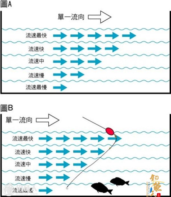 这两种现像说明了流水表层流速一般都比底层快,若你的钓组投入水后就不加以适当的操控,那个在流速最快的流水表层的浮波必定被流速推到前面(流尾);而你的钓饵仍跟着在后面(流头)追赶,这现像会让鱼儿来咬时先发现你的钓组而非钓饵(见图B)。
