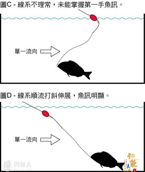 2)按情况控定跑得老快的浮波,以望能将钓组顺着流水打斜伸展,以掌握第一手鱼訉(见图D)。