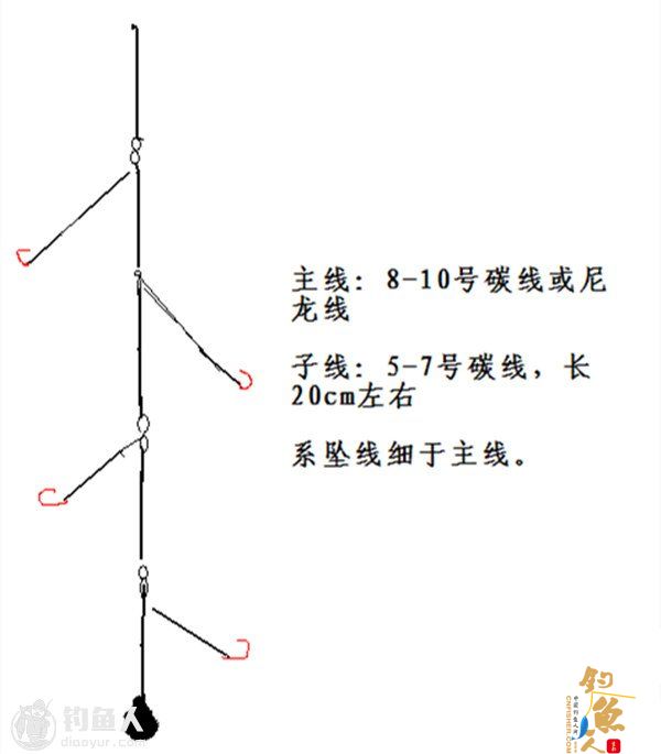 钓组很简单,就是用串钩,只不过线和钩的号数比较大,主线用8-10号尼龙线或碳线,子线用5-7号碳线,或者再大个1-2号,也无所谓。坠子在钓组最下面,最下面的子线与坠子平齐或略长。