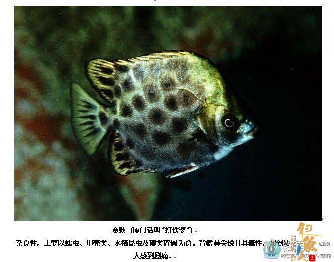 1、金钱鱼,学名Scatophagus argus,英文名Scat,商品名为金鼓鱼。金钱鱼科,成鱼体长约30厘米,原产于印度尼西亚、菲律宾、泰国等地的江河入海口的咸淡水交融水域,我国南方江河的入海口也常见。