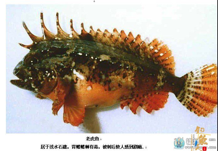 2、老虎鱼为毒鲉科鬼鲉属的鱼类,分布于朝鲜及日本本州中部以南各近海内以及广东北海等,属于近海底层杂鱼。体色随深度不同而异在近岸浅水区呈黑褐色;在外海深水区呈红色或黄色。体长可达200毫米。初夏产卵。 鬼鲉卵浮性。因鳍棘端部具膨大囊状毒腺组织,毒性强,被刺后剧烈阵痛,有时持续数天,故有“海蝎子”,“虎鱼”等名称。中国福建沿海将此鱼煮汤,治小儿疮疖症。肉可供食用。 花老虎鱼,大型南美慈鲷鱼,成鱼体长:30厘米。也是很受人喜欢的品种。在原产地更是一种受人欢迎的食用鱼。体形巨大,身体上的斑纹与其说是象老虎,还不如说是象豹子。所以,它也叫花豹石头鱼。