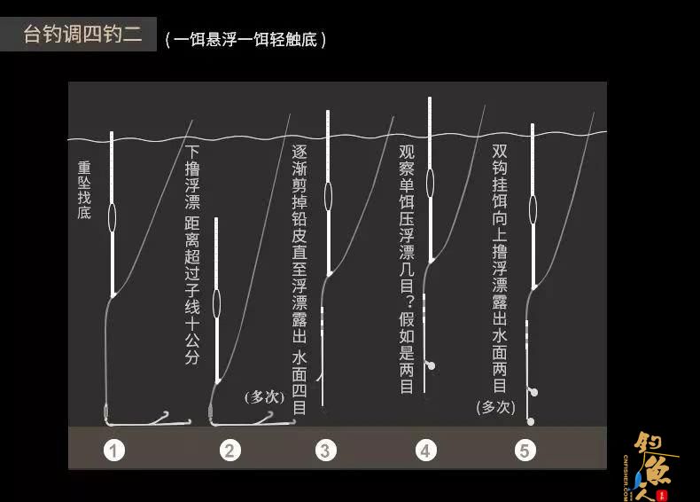 调四钓二的变化,随着浮漂上移,改成调四钓三、钓四钓四、调四钓五等情况时,饵料在水中的状态变化。