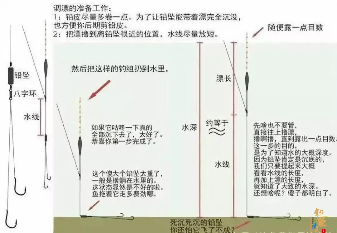 先粗找底,再调整调目,将浮漂全部没入水中,修剪铅皮知道露出需要的目数。