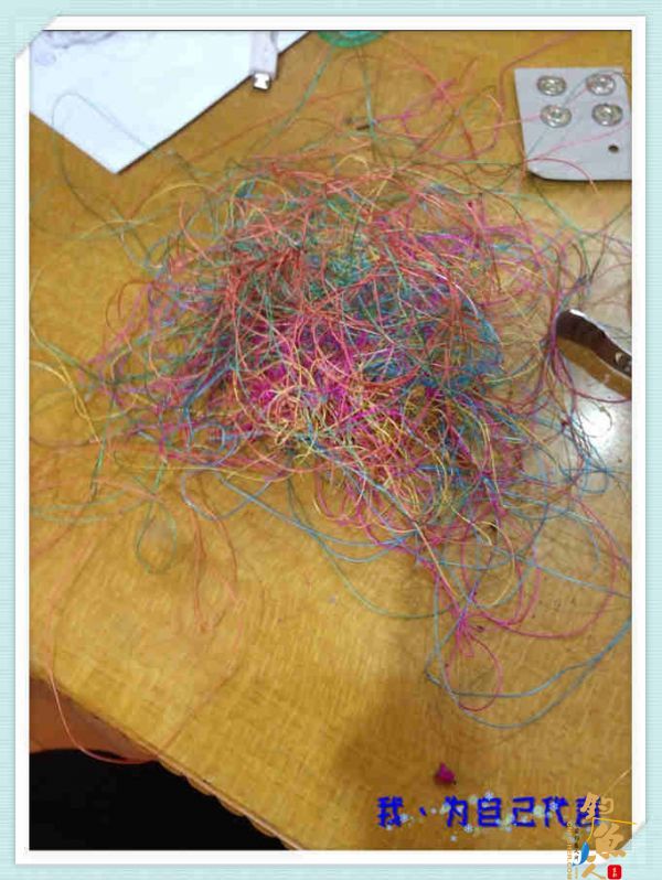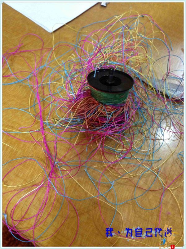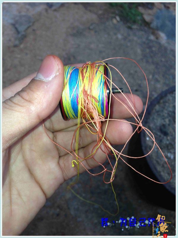 告诉大家其实初期炒粉一般松松线都是可以解开的,做法是看到哪根线压在主线上往旁边拨主线外抽就好,深度炒粉就只能剪线了,下面就是深度炒粉的状态。另外建议大家刚上手买些便宜的尼龙线做抛投就好,这样炒了也不心疼。