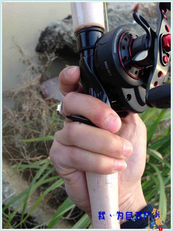 最后要说下抛投杆手势:这里要纠正一下误区,水滴轮配枪柄杆可不像直柄杆配纺车轮可用蛮力抛投,抛投到后面要有一种感觉,那就是弹杆,饵是在杆被舞动的同时被弹出去的,如下图所示如果右手抛竿的话左手要往回顶杆底。