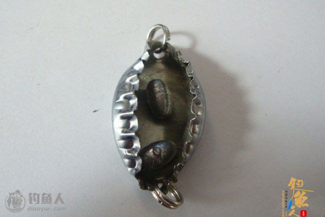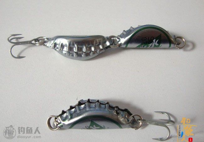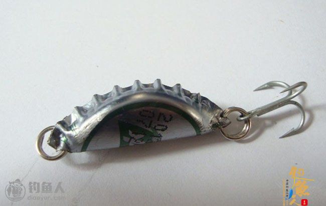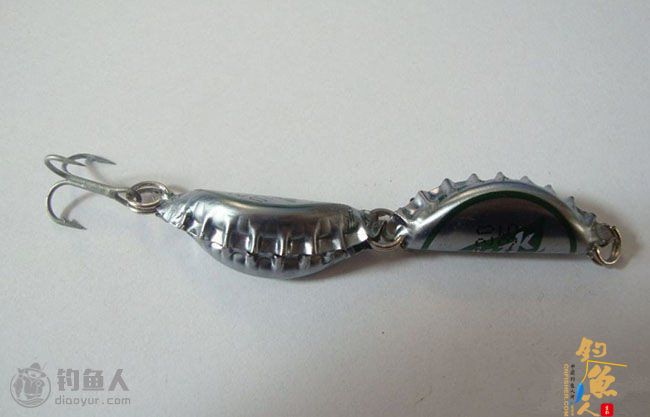 啤酒盖路亚:两边用钉子打孔,不要太靠边容易断开,放上圆铅坠,像捏饺子一样捏合,加上转环,挂上三本钩,完成。