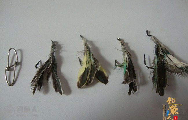 转环制作:回形针拉直,缠绕在粗细适中的螺丝刀上,用钳子绕上,取出后截断。一个回形针可以加工两个转环。羽毛钩:3号渔线缠绕羽毛固定,502涂抹。加个小铅坠或咬铅就可使用,当铅头钩用,省去软虫了~