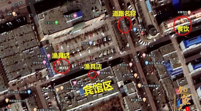 在图中的区域不仅有旅馆,还有2、3家渔具店和超市,购买渔具和船上吃喝的用品非常容易,记住晕船药一定要买,除非你确定自己不晕船,在渔具店买“大白兔”即可,一说这个名字就知道了,日本产的晕船药,效果非常好。就是副作用有点明显,容易口干和渴,多带些水。海城路向北走,到中山大道左转,开车不远就是海鲜市场,旁边胡同里早上6点多有河虾销售。