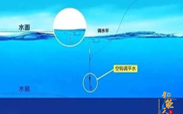 根据平时的情况来说,大多数钓鱼人都会选择调平水后钓一目,或者两目,但是我们应该考虑到,冬天鱼口本来就已经很轻了,我们能看到的半目或者顿口,实际就是漂目和漂目之间那黑色的一抹。所以我们需要特别说明的就是,虽然说是要调平水,但是也要是漂尖露出一点水面。为什么呢?冬季水温低,水底和水面的温度是不一样的,这在冬季尤其明显,如果漂尖不出水面,那么水底的温度压差会导致漂信严重的不准,举个例子,一般冬季结冰后,我们砸个窟窿后,调完漂后会发现时不时的会出现送漂的现象,这就是水底温度和水面温度差异导致的压力差,天气越冷越明显,这时候如果能做到漂尖出水,则能很好的泄掉水面的张力。如下图