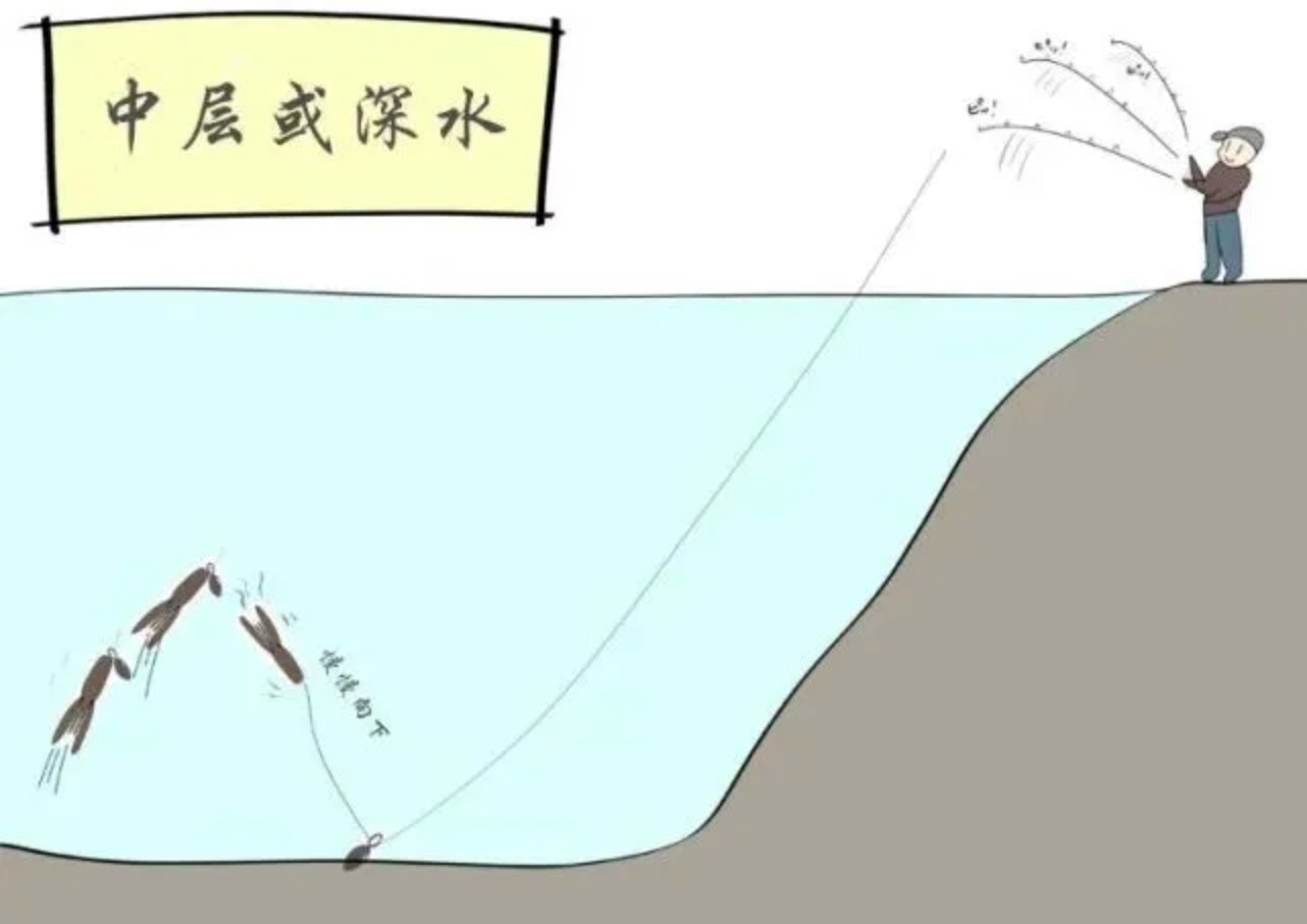 钓鱼人站立位置、水深也会影响自由钓组软饵的“自由下落”时间。