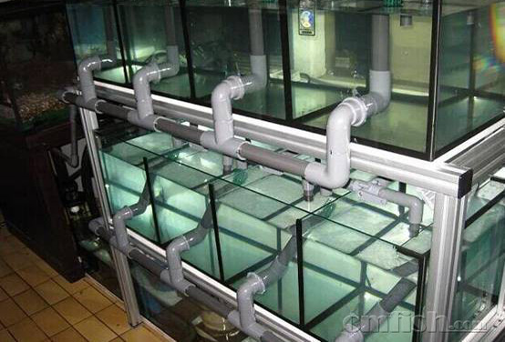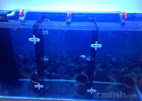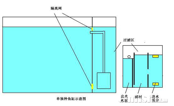 种鱼缸越简单越好。一般一个缸只能养一对种鱼,最好选用60-100升的方形玻璃鱼缸(40方起),如要考虑美观和混养(不同鱼类混养,要合理选择混养鱼类),就可用大一点的鱼缸。鱼缸最好不要加盖,方便管理。有些人刚下海就要挑战用20-30升水繁殖小丑鱼,这里不建议,一来容易失败,二来鱼也不舒服。我建议如果你一家人的住房面积是几平方,那鱼缸就用几升。缸不大,过滤区简单分3格即可,第一格进水加蛋分和加热棒(水冷),第二格放玻璃环、碎活石和过滤棉,第三格放上水泵。