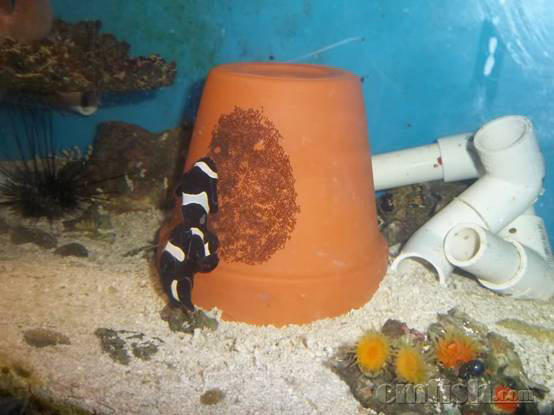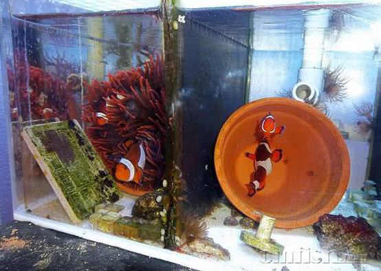 有多对种鱼的可考虑用组缸。组缸可以用一个大缸分割,也可以多个小缸组合。1-3对小丑用单独的缸较合适,3-6对小丑用一个大缸分割较方便,6对以上小丑用多个小缸组合较合理,大规模繁殖用一体缸或塑料桶甚至池子组合较经济。