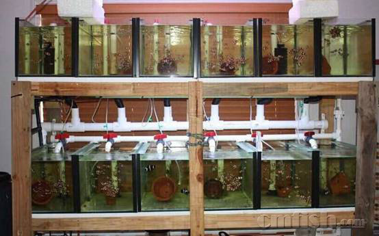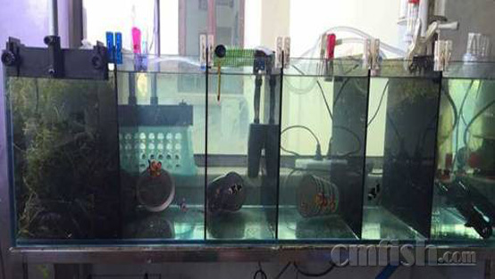 组缸包含一组小缸和一个过滤缸。小缸间分割用黑色或者蓝色较好,尽量不要用透明的,这样种鱼会觉得安全些,种鱼间也不会有争斗。小缸的尺寸不需要太大,20升左右即可。为保持水质,要有强大的过滤缸,可用蛋分、滤材、活石、厚沙、藻等过滤。