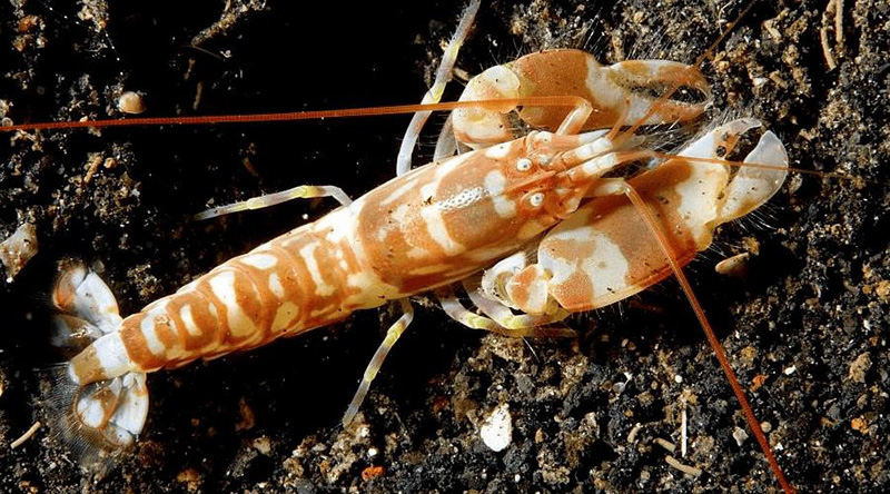 枪虾的种类非常多,他们最大的特点就是有一只巨大的钳子,这个大钳子的长度能达到身长的一半左右。海缸中最常见的枪虾是老虎枪虾,这种枪虾如果单独养一只就没意思了,因为老虎枪虾与其他很多品种枪虾一样,会和很多虾虎鱼之间存在着共生关系,非常有趣,所以他们也被叫做共生虾。