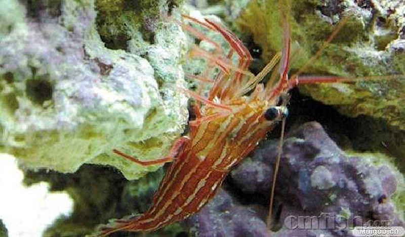 又叫骆驼虾,也是海缸中常见的虾之一,他们有清洁食物残渣的作用,通常也会成群活动。性情温和,容易饲养,不那么害羞,具有一定观赏性。
