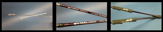 SEED VISION的竿体为X碳布编织,增加整体强度,在竿尖部分采用了高灵敏的实心高碳竿尖,并且在竿尖的部分做了一定的颜色处理,将竿尖涂装成了具有高辨识度的颜色。EVA材质握柄,轮座采用FUJI VSS轮座,导环方面官方页面并没有提及,不过推测也应该为FUJI系列导环。