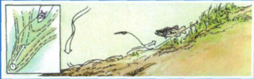 非鱼类产卵期间,希尔会在被水没过的草被中采用卡罗莱纳钓组,钓获异常得好。他主要注意水没植被的边缘,